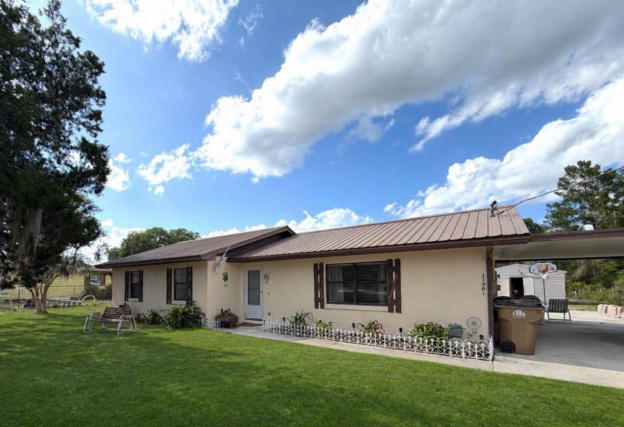 Welcome to 11301 Huggins Street -a beautifully UPDATED 3-bedroom, 2-bathroom single-family home ,with NO HOA, set on a generous NEARLY HALF-ACRE LOT and a SECONDARY STRUCTURE in the heart of Leesburg's desirable Lake County community. This home radiates warmth, character, and thoughtful care - the kind of property that feels like home before you even step through the front door.Inside, the spacious kitchen is a true showpiece, featuring solid wood cabinetry and solid surface countertops that showcase both beauty and durability. The kitchen flows seamlessly into the attached dining area, creating an inviting space for everyday meals and entertaining. Just off the kitchen, you'll find a convenient indoor laundry room and a spacious pantry with plenty of storage.The screened lanai provides the perfect retreat for enjoying Florida's beautiful weather year-round, whether you're sipping morning coffee or unwinding at sunset. Beyond the lanai, the expansive backyard is one of the standout features of the property. With nearly half an acre of land , you'll have the freedom to enjoy your property your way - with abundant room for gardening, outdoor entertaining, a play set, fire pit area, pets, or simply enjoying the open Florida sky. A large driveway offers space for the vehicles and toys!Adding even more versatility, the backyard includes a substantial 467-square-foot detached building already wired with electricity - ideal for a workshop, studio, hobby space, storage, or future creative use.Major updates add exceptional value and peace of mind, including a lifetime insulated metal roof, installed just 11 years ago, with energy-efficient insulation panels underneath to help keep the home comfortable year-round and potentially reduce utility costs. The water heater was also replaced just 3 years ago.Conveniently located just minutes from the mall, hospital, shopping, dining, and nearby fishing, this home also offers easy access to Central Florida's world-famous attractions, with Walt Disney World and theme parks less than an hour away. Sanford Airport is 51 min away and Orlando International is one hour away.This warm and well-cared-for Leesburg home offers space, updates, flexibility, convenience, freedom, and outdoor living -all in one inviting property. This one won't last! Chickens and roosters allowed!